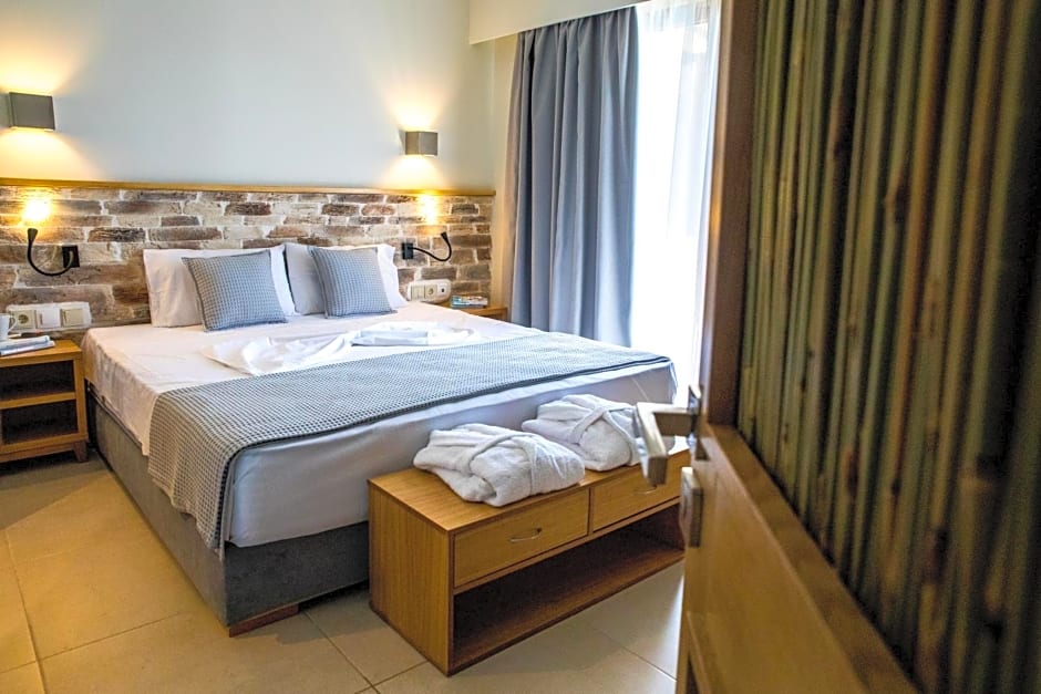 Overlooking the pool and the Aegean Sea from its furnished balcony, this tastefully decorated room is located on the first floor. It offers air conditioning, a flat-screen TV, mini fridge, safe, a kettle with tea/coffee facilities, and a private bathroom with shower cabin and hairdryer.